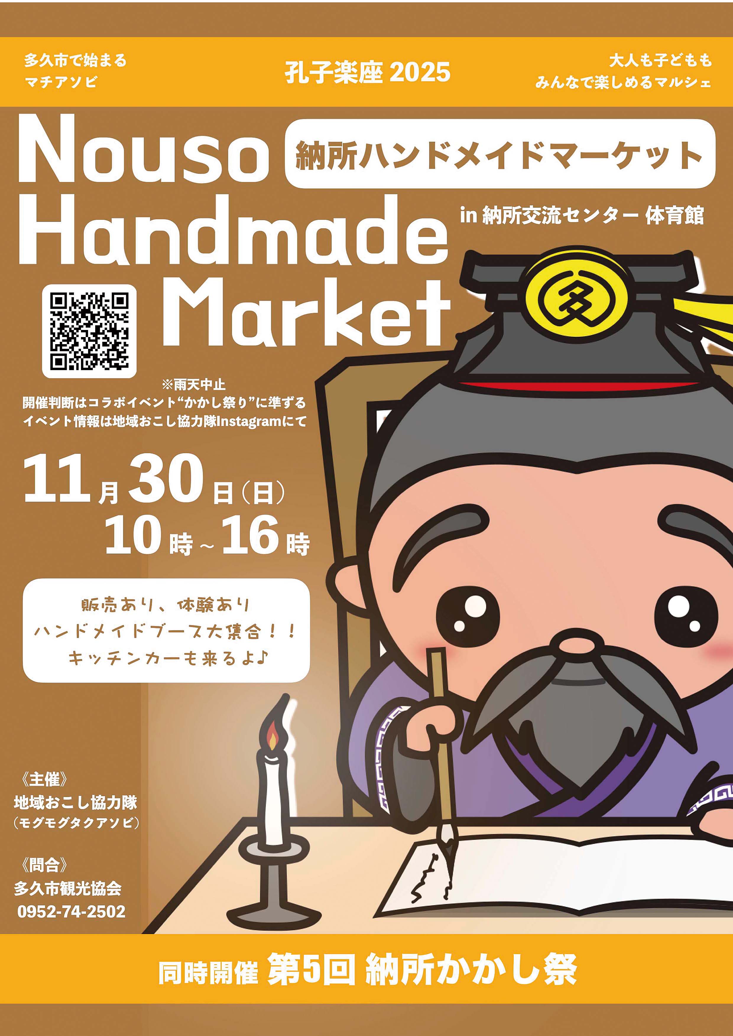納所(のうそ)ハンドメイドマーケット 令和7年11月28日 掲載 ~多久市で新たに始まるマチアソビ~多久市観光協会に在籍する地域おこし協力隊が主催するマルシェの第3弾。第5回納所かかし祭とのコラボ開催。ハンドメイド作品を中心に体験コーナーやキッチンカーも出店予定。 日時:令和7年11月30日(日)10時~16時(雨天の場合はかかし祭りに準じる) 場所:東多久町・納所交流センター体育館 主催:地域おこし協力隊 問い合わせ:多久市観光協会 電話:0952-74-2502