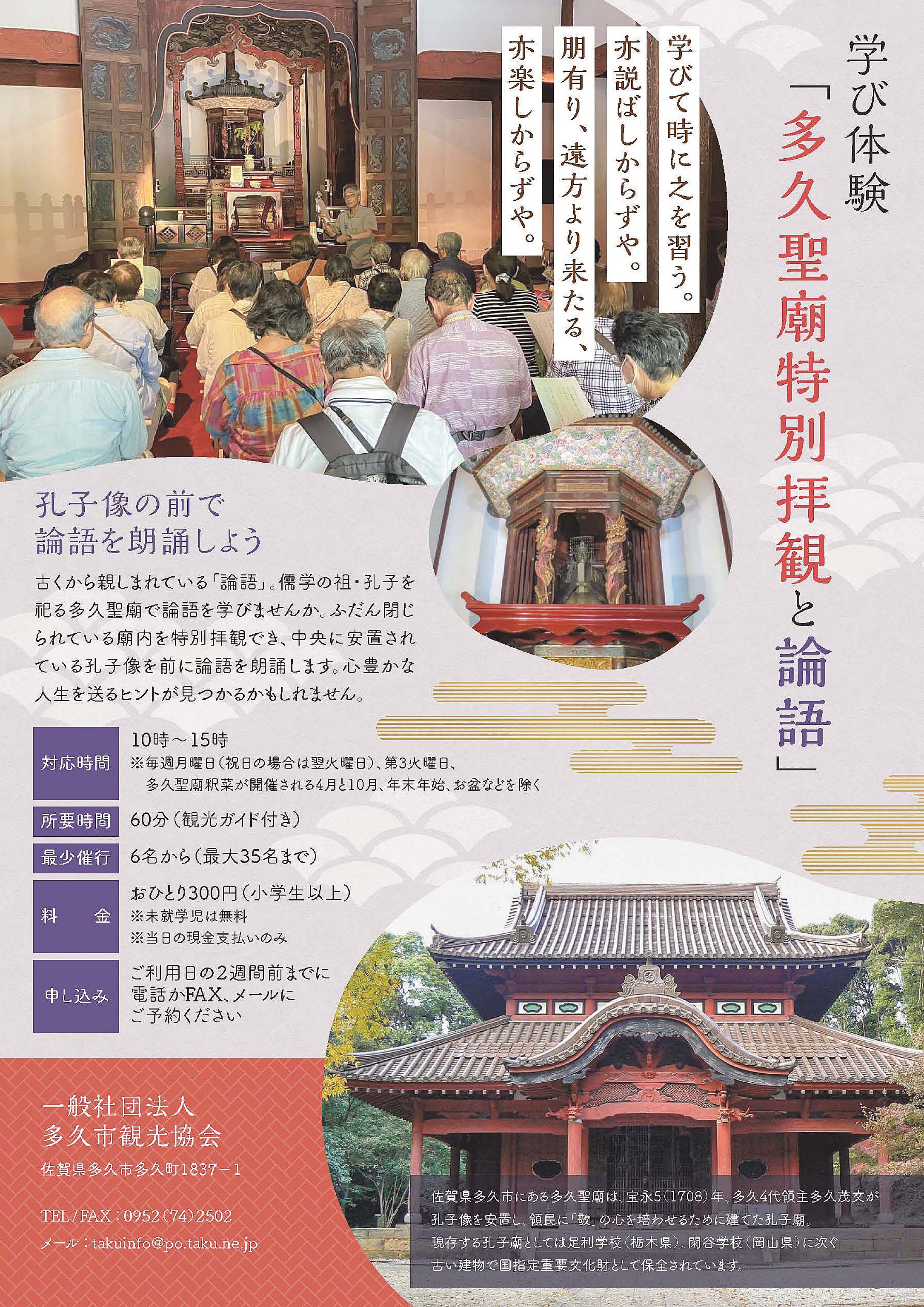 この旅、多久市観光協会では、古くから親しまれている「論語」に触れていただければと思い、ふだんは中にはいることができない多久聖廟内を特別拝観でき、中央に安置されている孔子像を前に論語を朗誦する、観光ガイドつきの「多久聖廟を特別拝観と論語朗誦」プランを販売中です。